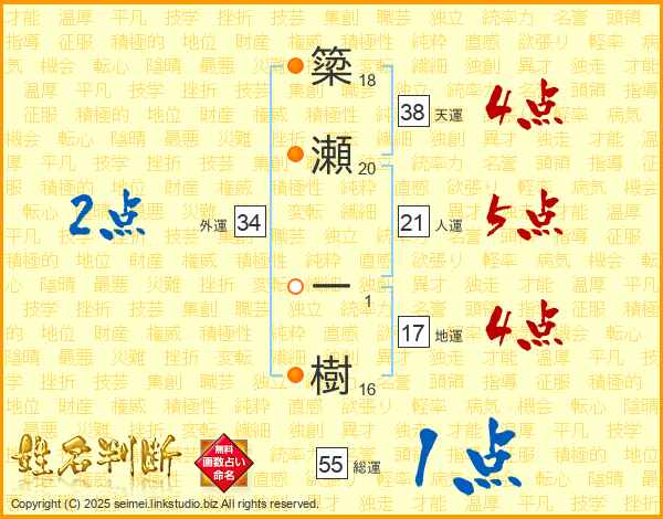 簗瀬一樹さんの天運は38画の4点!