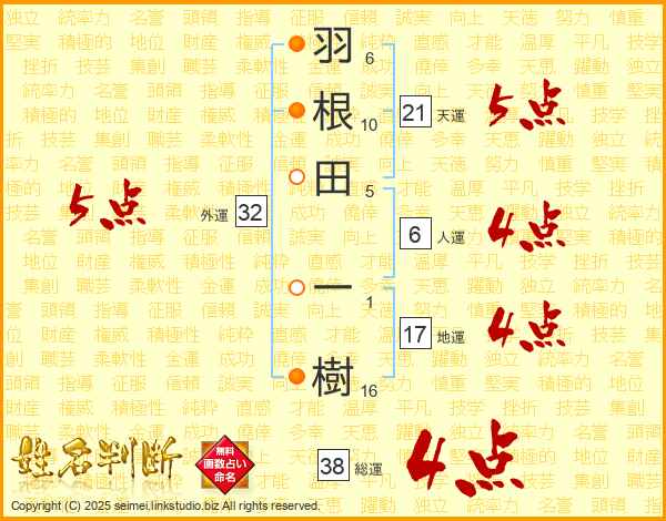羽(6画)根(10画)田(5画) 一(1画)樹(16画)
