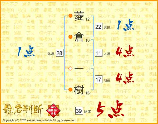 菱(12画)倉(10画) 一(1画)樹(16画)