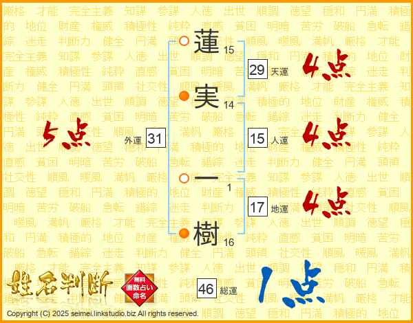 蓮(15画)実(14画) 一(1画)樹(16画)