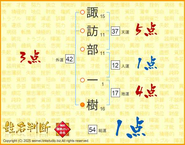 諏(15画)訪(11画)部(11画) 一(1画)樹(16画)