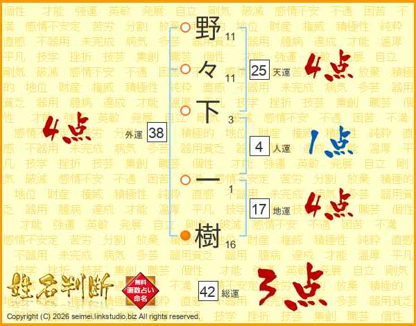 野(11画)々(11画)下(3画) 一(1画)樹(16画)