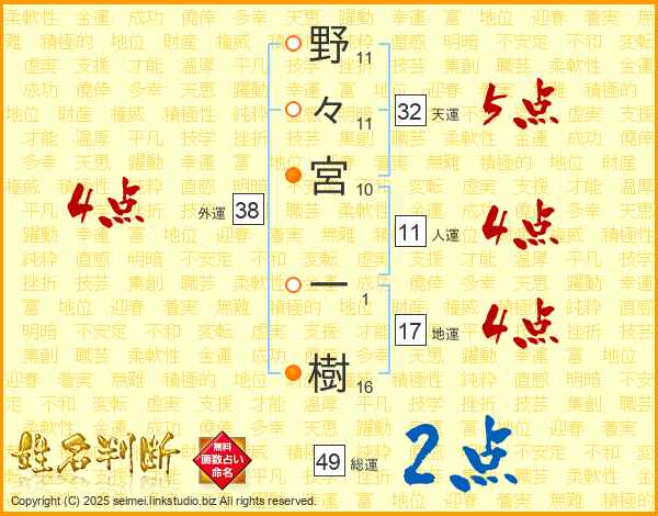 野々宮一樹さんの総運は49画の2点!