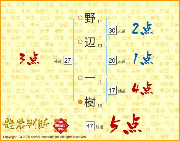 生活面を象徴する運勢です。外部から受ける影響力を表し、結婚運、家庭運や職場、環境への順応性を表します。総運から人運を引いた画数。姓や名が1文字の場合を除く。