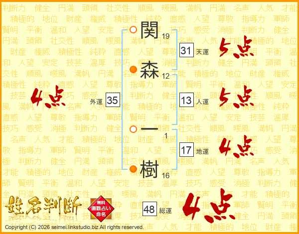 生活面を象徴する運勢です。外部から受ける影響力を表し、結婚運、家庭運や職場、環境への順応性を表します。総運から人運を引いた画数。姓や名が1文字の場合を除く。