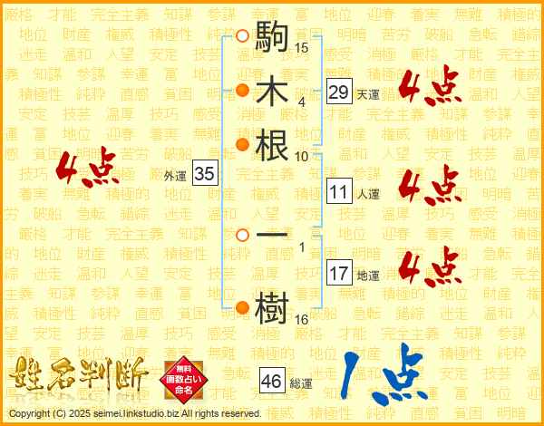 駒(15画)木(4画)根(10画) 一(1画)樹(16画)