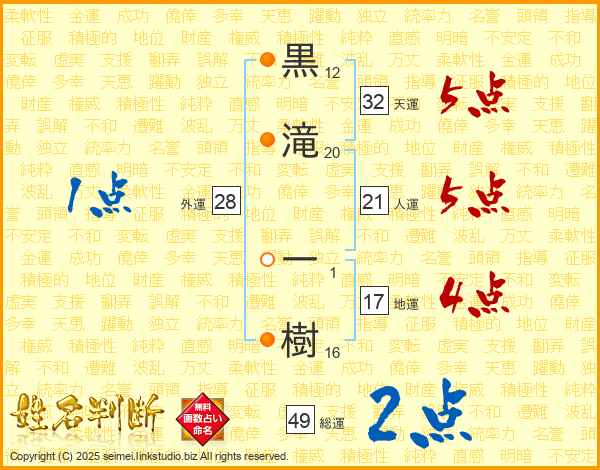 黒(12画)滝(20画) 一(1画)樹(16画)