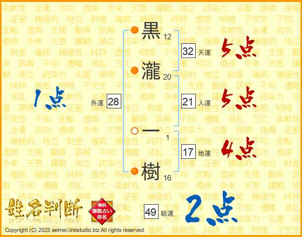 黒(12画)瀧(20画) 一(1画)樹(16画)