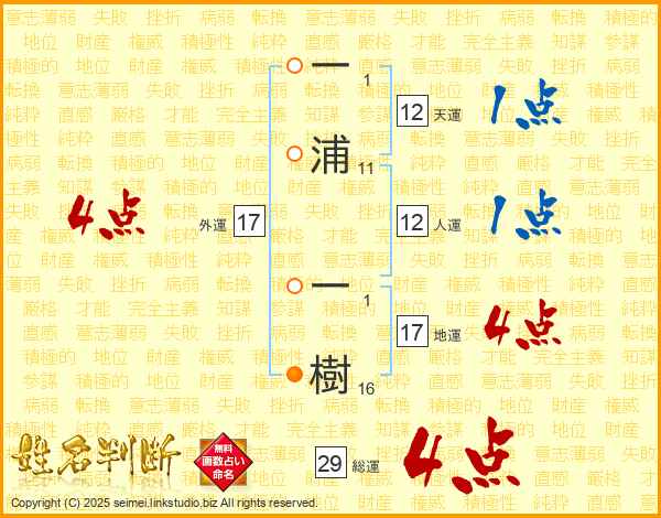 一浦一樹さんの地運は17画の4点!