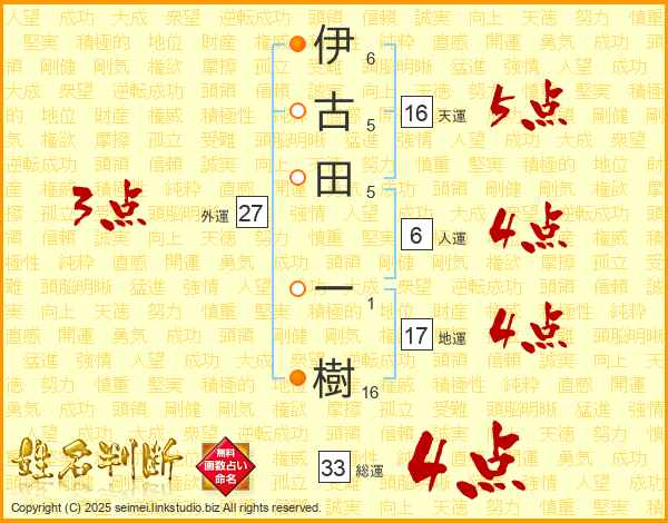 伊(6画)古(5画)田(5画) 一(1画)樹(16画)