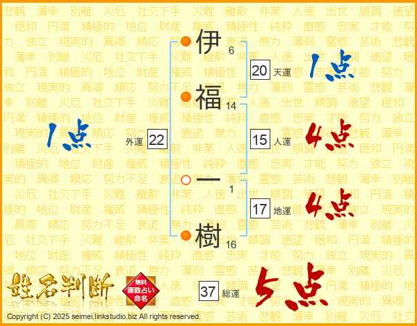 あなたの人生を表す1番重要な運勢です。生涯を通じて影響する総合運となり、主に50歳以降の晩年期に影響を及ぼします。苗字と名前の合計画数。