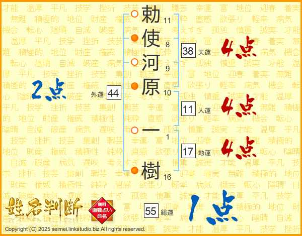 勅(11画)使(8画)河(9画)原(10画) 一(1画)樹(16画)