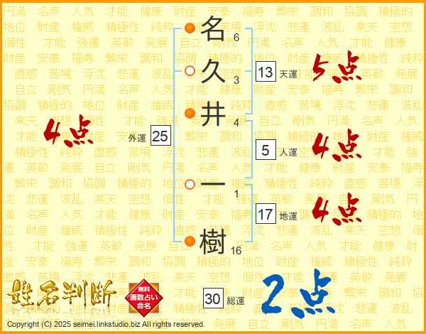 名(6画)久(3画)井(4画) 一(1画)樹(16画)