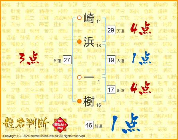 崎(11画)浜(18画) 一(1画)樹(16画)