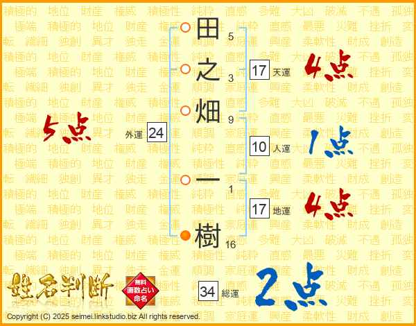 田(5画)之(3画)畑(9画) 一(1画)樹(16画)
