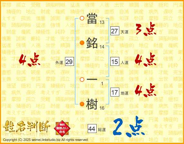 あなたの人生を表す1番重要な運勢です。生涯を通じて影響する総合運となり、主に50歳以降の晩年期に影響を及ぼします。苗字と名前の合計画数。