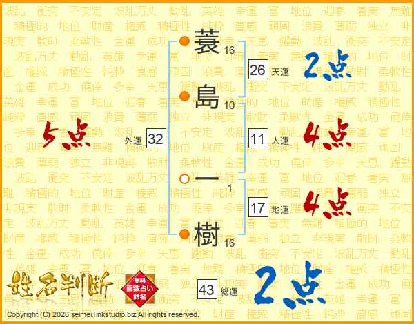 蓑(16画)島(10画) 一(1画)樹(16画)
