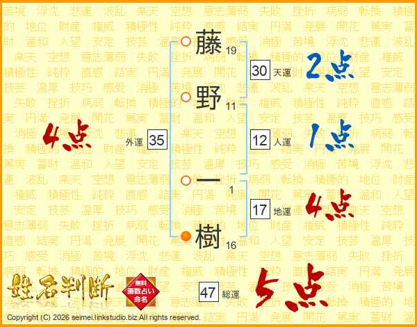 あなたの人生を表す1番重要な運勢です。生涯を通じて影響する総合運となり、主に50歳以降の晩年期に影響を及ぼします。苗字と名前の合計画数。