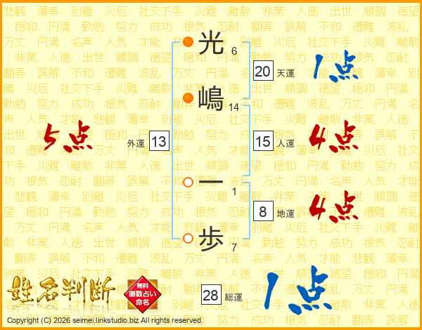 光(6画)嶋(14画) 一(1画)歩(7画)