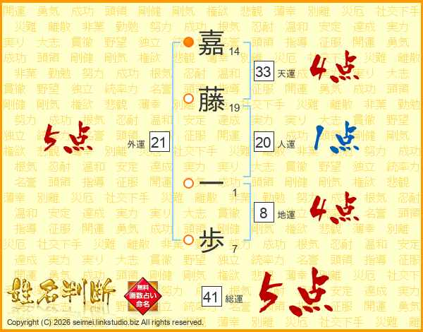 嘉(14画)藤(19画) 一(1画)歩(7画)