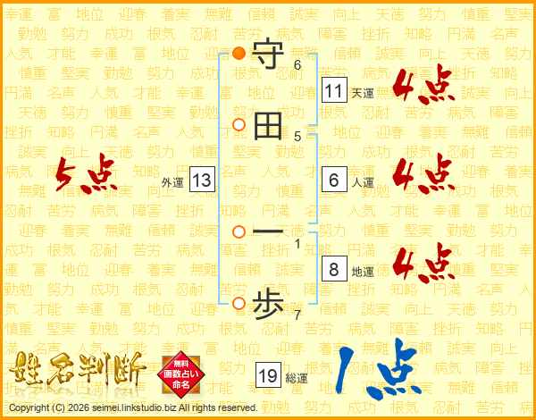生活面を象徴する運勢です。外部から受ける影響力を表し、結婚運、家庭運や職場、環境への順応性を表します。総運から人運を引いた画数。姓や名が1文字の場合を除く。