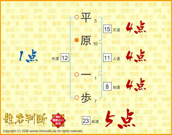 生活面を象徴する運勢です。外部から受ける影響力を表し、結婚運、家庭運や職場、環境への順応性を表します。総運から人運を引いた画数。姓や名が1文字の場合を除く。