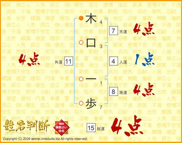 木(4画)口(3画) 一(1画)歩(7画)