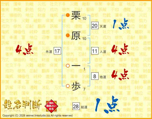 生活面を象徴する運勢です。外部から受ける影響力を表し、結婚運、家庭運や職場、環境への順応性を表します。総運から人運を引いた画数。姓や名が1文字の場合を除く。