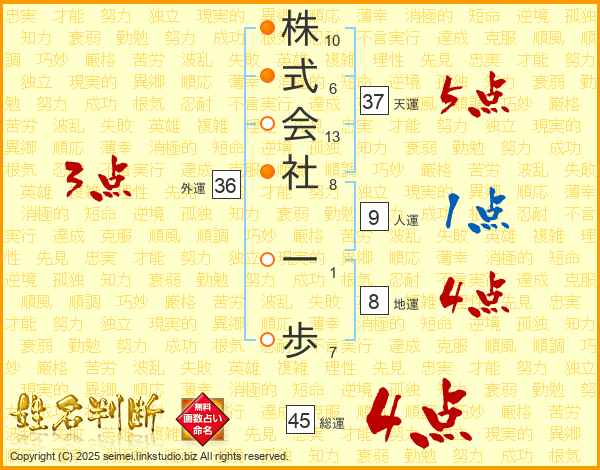 株(10画)式(6画)会(13画)社(8画) 一(1画)歩(7画)