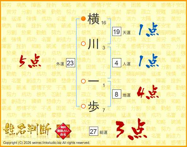 生活面を象徴する運勢です。外部から受ける影響力を表し、結婚運、家庭運や職場、環境への順応性を表します。総運から人運を引いた画数。姓や名が1文字の場合を除く。