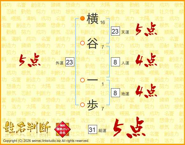 生活面を象徴する運勢です。外部から受ける影響力を表し、結婚運、家庭運や職場、環境への順応性を表します。総運から人運を引いた画数。姓や名が1文字の場合を除く。