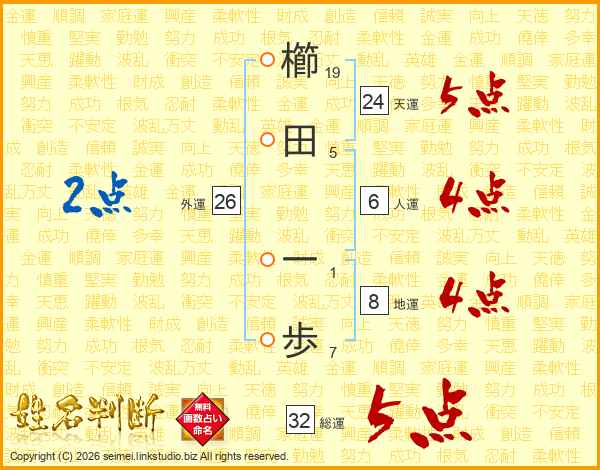生活面を象徴する運勢です。外部から受ける影響力を表し、結婚運、家庭運や職場、環境への順応性を表します。総運から人運を引いた画数。姓や名が1文字の場合を除く。