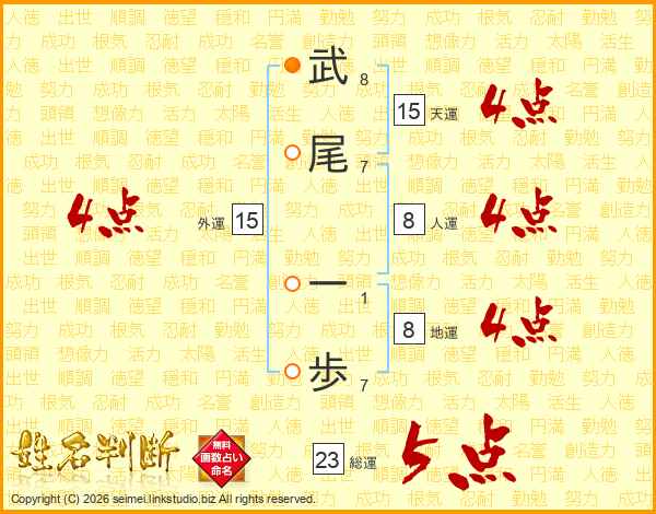 生活面を象徴する運勢です。外部から受ける影響力を表し、結婚運、家庭運や職場、環境への順応性を表します。総運から人運を引いた画数。姓や名が1文字の場合を除く。