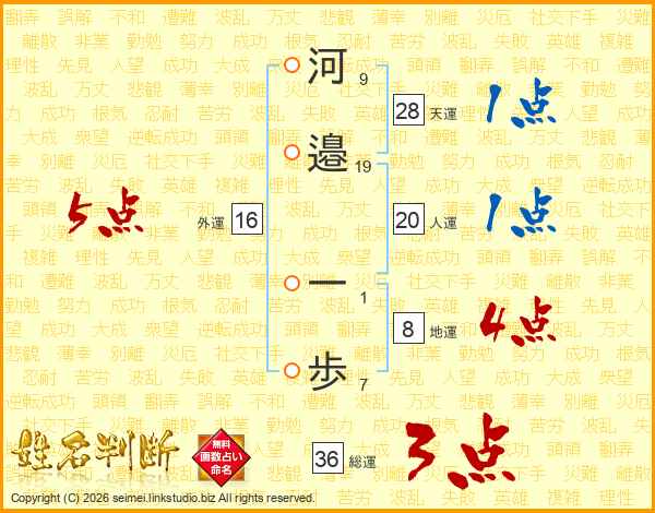生活面を象徴する運勢です。外部から受ける影響力を表し、結婚運、家庭運や職場、環境への順応性を表します。総運から人運を引いた画数。姓や名が1文字の場合を除く。