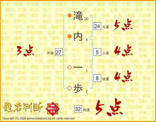 生活面を象徴する運勢です。外部から受ける影響力を表し、結婚運、家庭運や職場、環境への順応性を表します。総運から人運を引いた画数。姓や名が1文字の場合を除く。