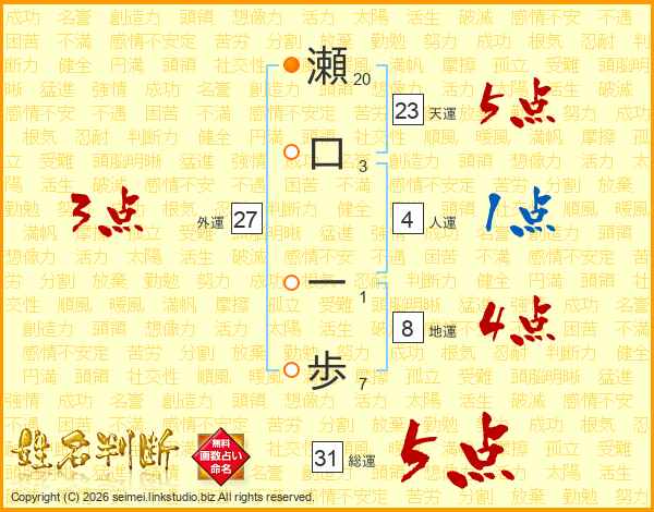 瀬口一歩さんの天運は23画の5点!