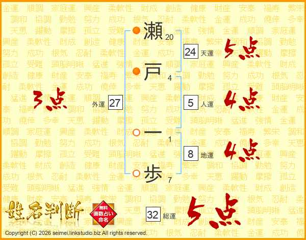 瀬(20画)戸(4画) 一(1画)歩(7画)