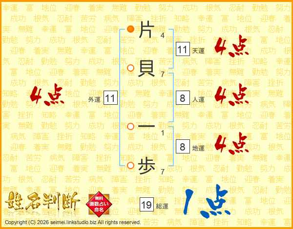 片(4画)貝(7画) 一(1画)歩(7画)