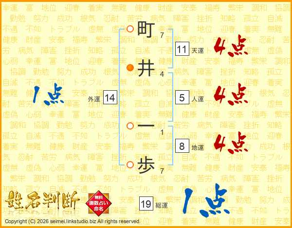 生活面を象徴する運勢です。外部から受ける影響力を表し、結婚運、家庭運や職場、環境への順応性を表します。総運から人運を引いた画数。姓や名が1文字の場合を除く。