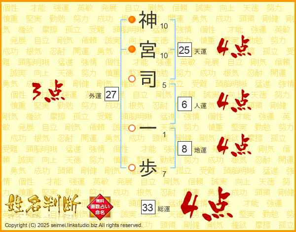神(10画)宮(10画)司(5画) 一(1画)歩(7画)