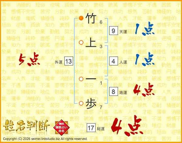 生活面を象徴する運勢です。外部から受ける影響力を表し、結婚運、家庭運や職場、環境への順応性を表します。総運から人運を引いた画数。姓や名が1文字の場合を除く。