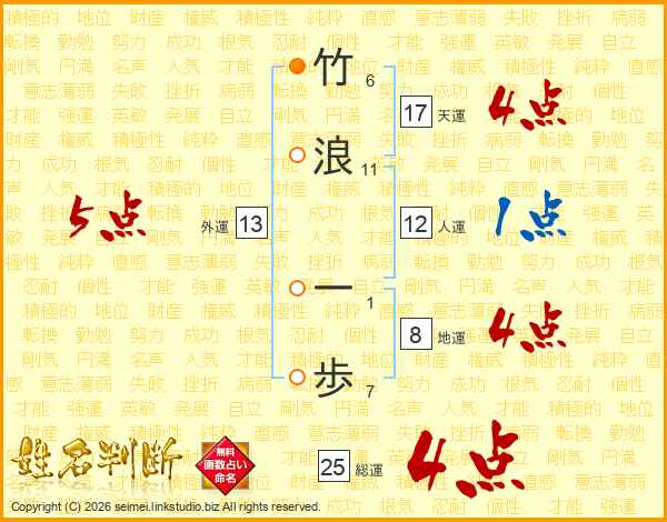 竹(6画)浪(11画) 一(1画)歩(7画)