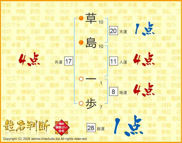 生活面を象徴する運勢です。外部から受ける影響力を表し、結婚運、家庭運や職場、環境への順応性を表します。総運から人運を引いた画数。姓や名が1文字の場合を除く。