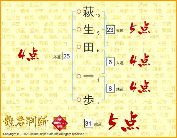 生活面を象徴する運勢です。外部から受ける影響力を表し、結婚運、家庭運や職場、環境への順応性を表します。総運から人運を引いた画数。姓や名が1文字の場合を除く。