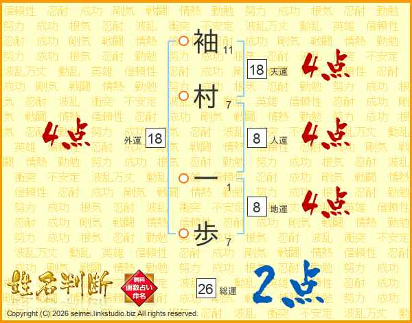 生活面を象徴する運勢です。外部から受ける影響力を表し、結婚運、家庭運や職場、環境への順応性を表します。総運から人運を引いた画数。姓や名が1文字の場合を除く。