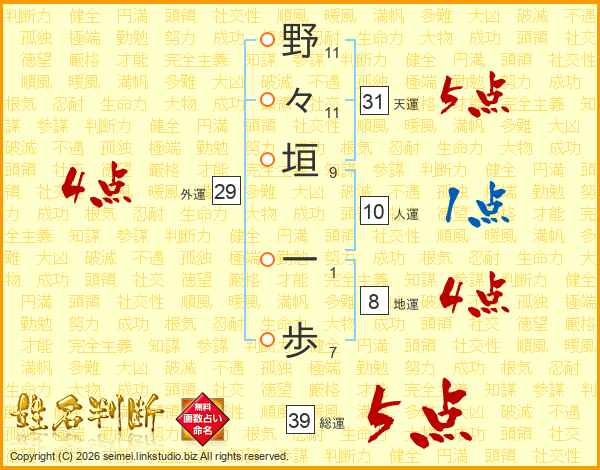 生活面を象徴する運勢です。外部から受ける影響力を表し、結婚運、家庭運や職場、環境への順応性を表します。総運から人運を引いた画数。姓や名が1文字の場合を除く。