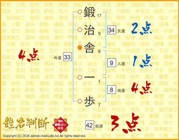 鍛(17画)治(9画)舎(8画) 一(1画)歩(7画)