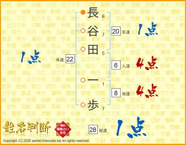 長(8画)谷(7画)田(5画) 一(1画)歩(7画)