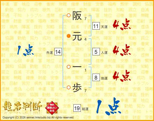 生活面を象徴する運勢です。外部から受ける影響力を表し、結婚運、家庭運や職場、環境への順応性を表します。総運から人運を引いた画数。姓や名が1文字の場合を除く。
