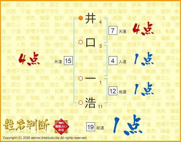 井(4画)口(3画) 一(1画)浩(11画)